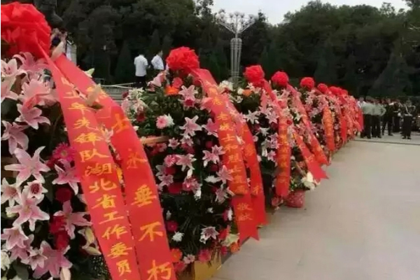 中共湖北省委、省人大常委會(huì)、省人民政府、省政協(xié),省軍區(qū),省各民主黨派、工商聯(lián)和無黨派人士,老同志、老戰(zhàn)士和烈士遺屬,省各人民團(tuán)體、各界群眾,中國(guó)少年先鋒隊(duì)湖北省工作委員會(huì)分別敬獻(xiàn)的9個(gè)花籃一字排開,擺放在紀(jì)念碑前廣場(chǎng)上。花籃的紅色緞帶上寫著“烈士永垂不朽”。