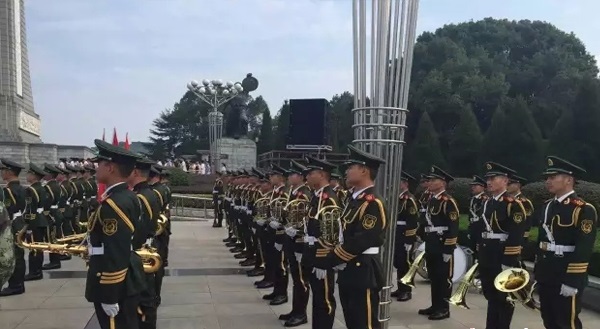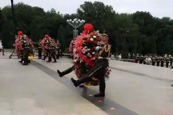 緊接著,軍樂團(tuán)奏響《獻(xiàn)花曲》,18個(gè)禮兵托起9個(gè)花籃,緩緩走上臺(tái)階,把花籃擺放到紀(jì)念碑前。