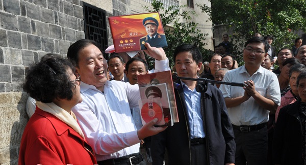 徐海東大將之女、北京開國元勛文化促進會會長徐文惠(圖左一)向紅安縣贈送相關(guān)書籍和影像資料。