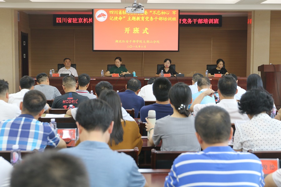 2019年6月10日下午15:00,四川省駐京機(jī)構(gòu)黨委"不忘初心 ?牢記使命”主題教育黨務(wù)干部培訓(xùn)班在湖北紅安干部學(xué)院大別山分院舉行開班儀式,四川省人民政府駐京辦機(jī)構(gòu)黨委書記袁敏出席開班式并作動員講話,湖北紅安干部學(xué)院副院王曉琴出席開班式并致歡迎詞,湖北紅安革命紀(jì)念地管理中心副主任、湖北紅安干部學(xué)院大別山分院副院長張盛潮出席開班式。