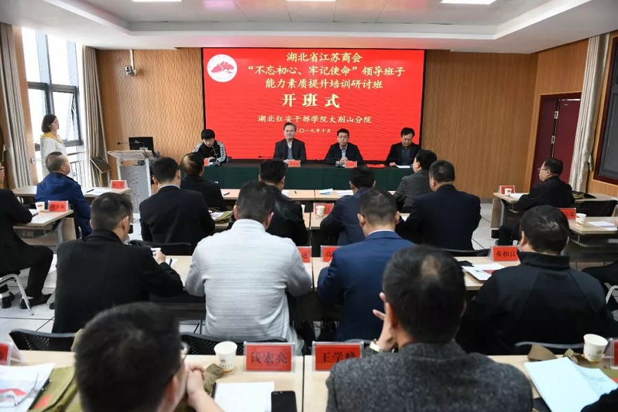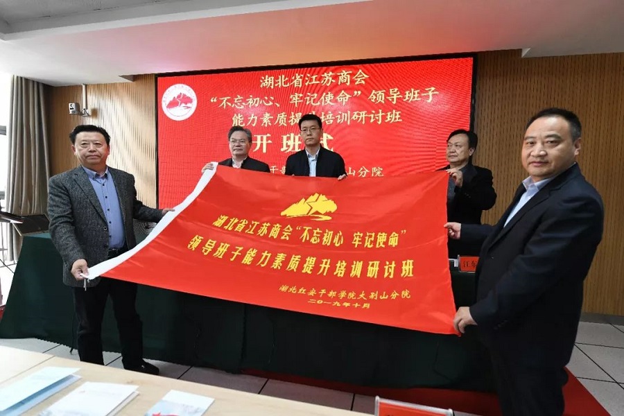2019年10月30日,湖北省江蘇商會(huì)“不忘初心、牢記使命”領(lǐng)導(dǎo)班子能力素質(zhì)提升培訓(xùn)研討班在湖北紅安干部學(xué)院大別山分院開班。會(huì)長李興東、黨委書記沈京喜、常務(wù)副會(huì)長俞衛(wèi)、張書林與副會(huì)長、理事共30余人,參加了培訓(xùn)班。