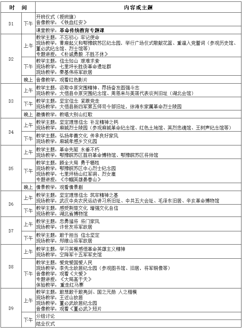 湖北大別山革命傳統(tǒng)教育基地九天班課程安排