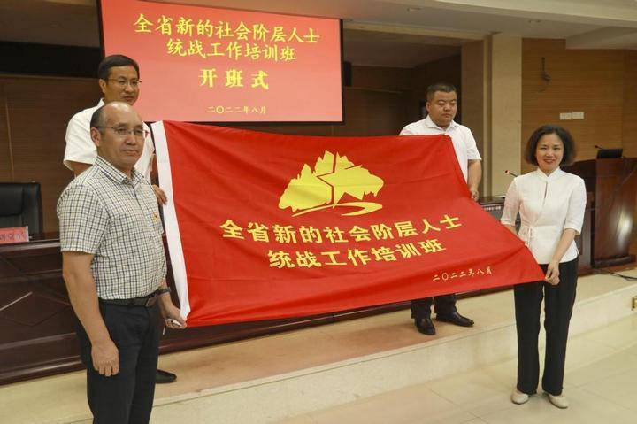 紅安縣委書記劉堂軍和省委統(tǒng)戰(zhàn)部新階層處處長(zhǎng)袁偉給培訓(xùn)班授班旗。